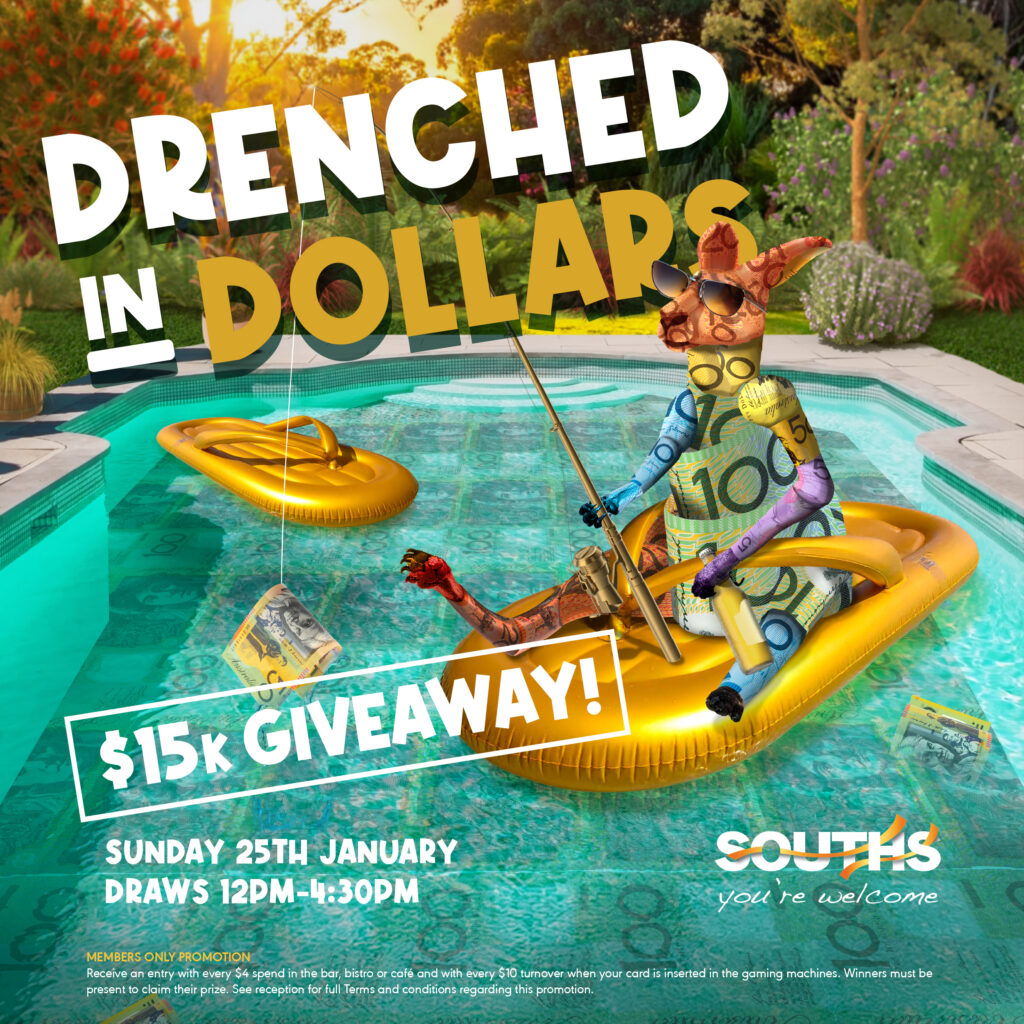 Get ready to be Drenched in Dollars with a share of $15,000 up for grabs at Souths! Join us on Sunday 25th January from 12pm–4:30pm for this exciting giveaway where lucky members will walk away with cash prizes throughout the afternoon.